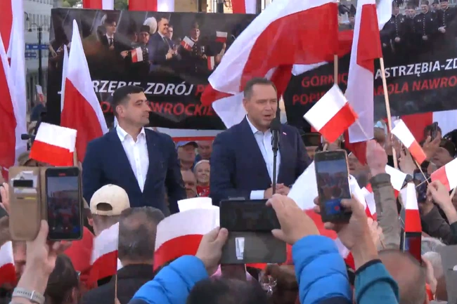 „Mi-am întrerupt campania în România pentru a fi aici, alături de voi. Pentru că nu e vorba doar de România. Dacă voi învinge în România, duminică - și, cu ajutorul lui Dumnezeu, voi învinge - nu va fi de ajuns. Avem nevoie de prieteni, de frați. Suntem frați! Vrem respect pentru muncitorii din minele de cărbune, în Polonia și România. Vrem respect pentru fermierii din ambele țări. Vă promit că, în calitate de nou președinte român, voi veni zilnic pentru a face campanie pentru Karol Nawrocki, pentru că el trebuie să fie noul președinte al Poloniei. Dacă vin din România în ultima săptămână a campaniei pentru a fi aici cu voi, pentru Karol Nawrocki, vă rog să faceți la fel”, a spus Simion, de pe scenă.