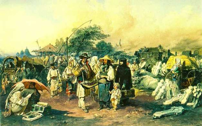 Căruţele cu coviltir sunt un fel de rulote-tarabă, am zice azi, iar nu departe de ele, o femeie se remontează, dând pe gât un ţoi de ţuică, pe care a plătit o sumă infimă. Mocanca, însoţită de copil şi de-o călugăriţă, se uită după chilipiruri, la umbra pălăriei de pai.