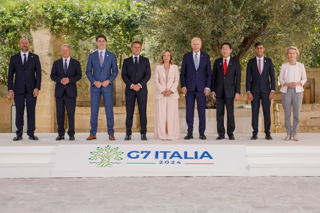 Foto: Cei șapte lideri politici la Summit-ul G7 cu liderii UE de la Borgo Egnazia (Brindisi) pe 13 iunie 2024 în Apulia, Italia