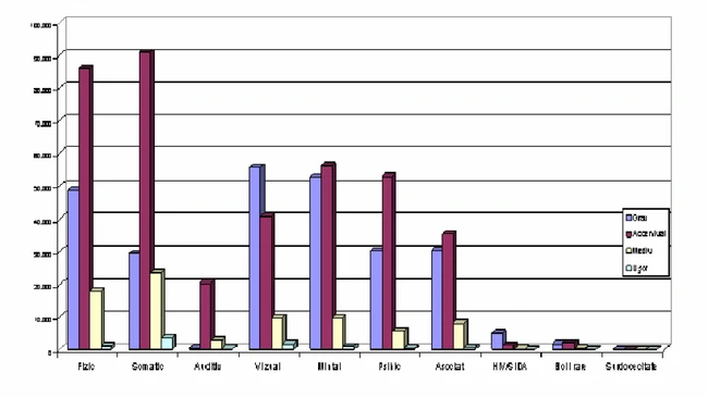Sursa: Buletin Statistic, Ministerul Muncii, Familiei, Protecţiei Sociale şi Persoanelor Vârstnice - Direcţia Protecţia Persoanelor cu Dizabilităţi (Axa Y: de la 10.000 la 90.000; Axa X: fizic, somativ, auditiv, vizual, mental, psihic, asociat, HIV/SIDA, boli rare, surdocitate; Legendă: albastru - grav, roşu - accentuat, galben - mediu, verde-uşor)