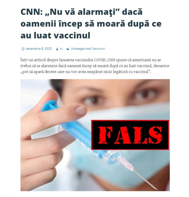 Un material care are legătură directă cu isteria anti-vaccin stârnită din zona conspiraţioniştilor, inclusiv a grupurilor fundamentalist-ortodoxiste, îşi bazează mesajul manipulator pe ruperea din context a spuselor unei specialiste în imunizare, dr. Kelly Moore, citată de CNN. Titlul articolului în română este: ”„Nu vă alarmaţi” dacă oamenii încep să moară după ce au luat vaccinul”. În acelaşi timp, citatul la care se referă titlul este: ”We would not at all be surprised to see, coincidentally, vaccination happening and then having someone pass away a short time after they receive a vaccine, not because it has anything to do with the vaccination but just because that's the place where people at the end of their lives reside. (…) One of the things we want to make sure people understand is that they should not be unnecessarily alarmed if there are reports, once we start vaccinating, of someone or multiple people dying within a day or two of their vaccination who are residents of a long-term care facility. That would be something we would expect, as a normal occurrence, because people die frequently in nursing homes.” – ”Nu am fi surprinşi să vedem, în acelaşi timp, vaccinarea având loc şi apoi să avem pe cineva decedând la scurt timp după ce a primit vaccinul, nu pentru că are ceva de a face cu vaccinarea, ci pentru că este un loc în care locuiesc oameni aflaţi aproape de sfârşitul vieţii (…) Unul dintre lucrurile pe care vrem să fim siguri că le înţeleg oamenii este că nu ar trebui să fie alarmaţi în mod nejustificat dacă, o dată ce începem vaccinarea, vor exista raportări ale unor cazuri individuale sau multiple de deces la o zi sau două după vaccinare, rezidenţi ai unei instituţii de îngrijire pe termen lung. Asta ar fi ceva de aşteptat, ca un fenomen normal, pentru că oamenii mor frecvent în aziluri”. Astfel, observăm că dr. Moore se referea doar la aziluri dotate cu facilităţi de îngrijire medicală pe termen lung, ale căror rezidenţi, oameni cu vârste înaintate, vor fi şi ei vaccinaţi. Discuţia din articolul original de pe CNN se referă la gradul în care organismele în vârstă şi afectate de alte boli ar fi receptive la vaccinul anti-Covid-19. Iar mesajul pe care îl transmite dr. Moore este ca, dacă au loc cazuri de deces ale persoanelor în vârstă care primesc vaccinul la o zi sau două după ce se vaccinează, populaţia să nu se alarmeze în mod nejustificat ci să înţeleagă că la vârste înaintate, în aziluri, persoanele pot deceda din cauze care nu au legătură cu vaccinul, însă după vaccinare. Însă articolul în română la care ne referim nu spune clar că este vorba despre aziluri pentru bătrâni, ci le numeşte ”case de îngrijire”, dând de înţeles că persoanele pot deceda din cauza vaccinului, adică exact ceea ce nu spune articolul-sursă în limba engleză. Avem aici o mostră tipică de manipulare pentru generarea unei atitudini de frică şi isterie în faţa vaccinului anti-Covid-19 şi a acţiunilor de vaccinare. Dintr-un articol original explicativ, informativ, în care un medic specialist în imunizare încearcă să ofere cititorului o perspectivă de înţelegere mai bună a realităţii – oamenii în vârstă pot muri din cauze independente procesului de vaccinare chiar dacă s-au vaccinat – autorii textului românesc iau doar ceea ce le convine pentru a insinua că vaccinul omoară oameni în vârstă.