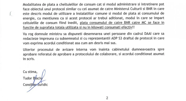 Iniţial (pre-epoca dlui Vasile), „propunerea“ ADP s.3 a primit răspuns negativ (adresa 9093/2018). Însă acum o săptămînă, pe 30 mai 2019, consilierul juridic Tudor Biaciu semna o Notă (nr. 2798), adresată ministrului Culturii şi SGA-ului Adrian Vasile, în care zice „no problem, boss, nu ne-mpiedică nici o lege, hai să facem un protocol cu ADP, că oricum la Minister transformatorul e supradimensionat pentru consumul clădirii“. Ceea ce e adevărat – pentru că el, transformatorul, a fost calibrat pentru visul frumos al unei Biblioteci Naţionale cu 995 de angajaţi şi activitate înfloritoare, ceea ce Biblioteca nu are (nici 995 de angajaţi - în 2017, existau doar 26% din cei 995 prevăzuţi prin Legea Bibliotecilor -, nici activitate duduitoare - doar 10% din colecţii sînt accesibile). Însă 995 de angajaţi etc. n-avea Biblioteca nici în 2016, cînd s-a semnat acordul-cadru şi s-a estimat consumul mediu de energie electrică – iar dacă acest consum estimat e depăşit, nu se mai aplică preţul preferinţial, ci unul mult mai mare. Conform datelor din bugetele aprobate şi din execuţiile bugetare, MCIN a consumat şi plătit cît a estimat, nu mai puţin, deci oricît ar fi capacitatea transformatorului, orice consum suplimentar se taxează suplimentar.