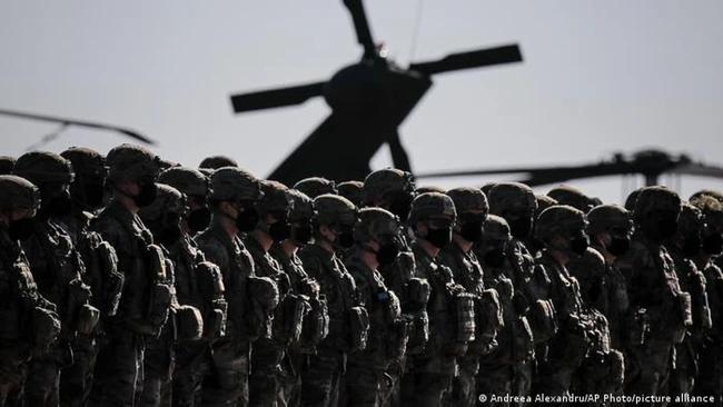 Soldaţi americani la baza militară Mihail Kogălniceanu, în timpul vizitei secretarului general NATO Jens Stoltenberg în România (11 februarie 2022)