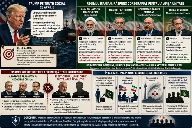 Post Scriptum: Când Donald Trump a scris pe Truth Social că Iranul „are dificultăți în a-și identifica liderul", a atins, poate involuntar, cel mai sensibil nerv al regimului de la Teheran. Răspunsul a venit rapid și coordonat — prea coordonat pentru a fi spontan. Într-un interval de câteva ore, trei dintre cele mai înalte funcții ale statului iranian — președintele, șeful justiției și președintele parlamentului — au postat pe X mesaje aproape identice, cu același slogan: „Un Dumnezeu, o națiune, un lider, o cale." În jurnalism, când toată lumea spune același lucru în același timp, întrebarea corectă nu este ce spun, ci de ce simt nevoia să o spună. Răspunsul se numește Vahidi. Generalul, una dintre figurile dure ale Corpului Gărzilor Revoluționare Islamice, reprezintă facțiunea care privește orice negociere cu Washingtonul ca pe o trădare a Revoluției Islamice. El a încercat deja să plaseze un om de-al său în delegația de negociere din Pakistan — un gest de control, nu de cooperare. Iar când delegații s-au întors la Teheran, IRGC le-a transmis fără echivoc: nu vorbiți în numele nostru. Aici se află adevărata poveste. Iranul nu negociază cu o singură voce. Araghchi și Ghalibaf stau la masa tratativelor; Vahidi stabilește liniile roșii din umbră. Americanii au realizat acest lucru abia după prima rundă de negocieri de la Islamabad. Declarațiile publice de „unitate" ale liderilor iranieni nu sunt un semn de forță — sunt o chitanță a presiunii interne. Iar atâta timp cât IRGC poate invalida orice acord negociat de guvern, orice progres diplomatic rămâne fragil, indiferent de câte sloganuri patriotice se postează pe rețelele sociale.