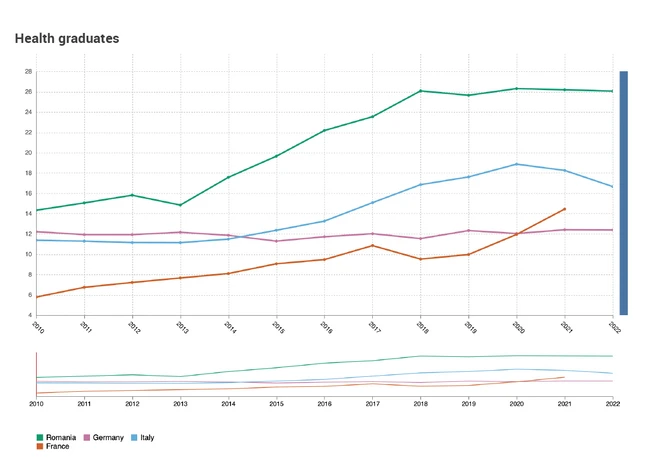 La nivel mondial, există un deficit semnificativ de cadre medicale. În Europa, Organizația pentru Cooperare și Dezvoltare Economică a raportat în 2022 un deficit de 1,2 milioane de profesioniști în domeniul sănătății. Pentru România, situația este și mai gravă - sistemul de sănătate pierde constant specialiști valoroși, cu toate că România nu duce lipsă de absolvenți ai facultății de medicină. A patra țară din Europa ca emitent de diplome de medic raportat la populație în 2022, cu o densitate de medici per locuitori de două ori mai mare decât Germania (Imaginea 1), Romania se confruntă de foarte multe ori cu lipsa personalului medical în spitale.
