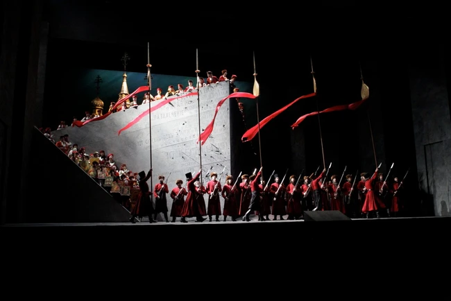 Curajul de a trata corul ca o masă compactă pe care îl asumi confirmă şi spiritul operei şi totodată această supunere colectivă proprie Rusiei...aici poporul se constituie natural în cor. În timp ce eroii se însingurează...splendidele decoruri şi imaginile protagoniştilor sunt pierdute în „imensitatea” rusă. Două forţe în prezenţă: poporul şi stăpânul. Unii mai nefericiţi decât ceilalţi.