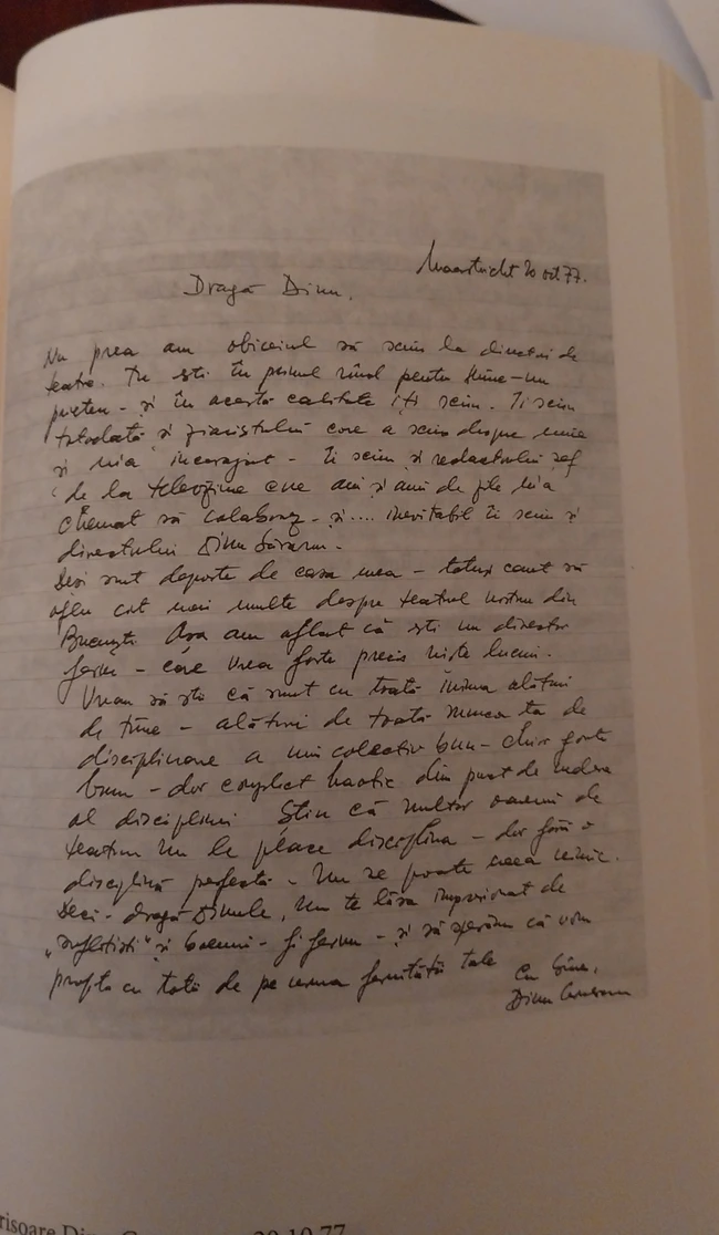 Nu prea am obiceiul să scriu la directori de teatru. Tu ești în primul rând pentru mine – un prieten – și în această calitate îți scriu. Îi scriu totodată și ziaristului care a scris despre mine și m-a încurajat. Îi scriu și redactorului șef de la televiziune care ani și ani de zile m-a cemat să colaborez și....inevitabil îi scriu și directorului Dinu Săraru.