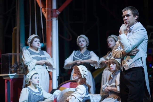 De ce spun asta? De ce cred că spectacolul se joacă de-a teatrul postdramatic? Fiindcă, până la un moment dat, Măniuţiu şi colaboratorii săi apropiaţi – Adrian Damian, semnatarul decorurilor, Şerban Ursachi, creatorul muzicii de spectacol şi coregrafa Vava Şteafănescu, lor alăturându-li-se Valentin Codoiu (costume) şi Lucian Moga (light design), dar şi actorii Teatrului ieşean- par să fi fost angrenaţi în înfăptuirea unei montări, a unei performance ce respectă testele de identificare specifice respectivului gen de teatru. Regizorul a creat ceea ce se cheamă un performance text în care regăsim trăsăturile caracteristice ale postdramaticului, aşa cum sunt ele inventariate de teoreticianul lui, Hans-Thies Lemann.
