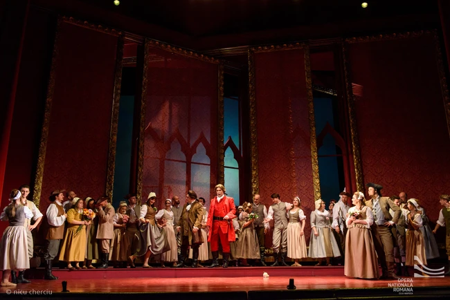 Relațiile între eroi au avut bune contururi, jocul de scenă s-a arătat eficient și convingător. În cadrajele de ansamblu, unui cor static (reușit preparat vocal de dirijorul său, Corneliu Felecan), Bosisio a adăugat mișcări grațioase de balerini în coregrafia Ancăi Opriș Popdan.