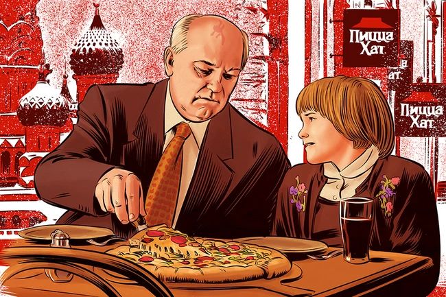 Tot de un mare simbolism este reclama din 1998, în care președintele Gorbaciov încurajează oamenii să vină la Pizza Hut. În acea perioadă, debutau în Rusia marile lanțuri internaționale de Fast Food. 24 de ani mai târziu au închis obloanele.