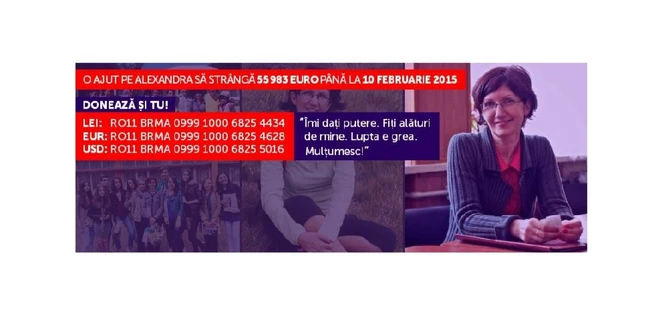0Azi e joi, 5 februarie.Luni, pe 10, Alexandra pleacă spre Viena unde o echipă de chirurgi îi va fi alături în lupta sa pentru viaţă. De alatăieri până azi, cei care o iubesc au făcut front comun şi au donat peste 6000 EUR. Până luni, are nevoie de 40000 EUR. Alexandra e om de şcoală. Dacă fiecare din cei cărora ne pasă de şcoală dăm azi şi mâine 1 LEU, facem o faptă bună pentru un om bun. Împreună reuşim!