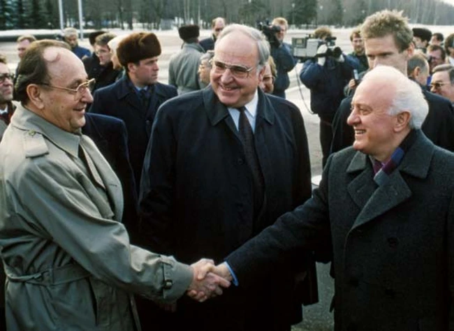 Vizita secretarului general al PCUS în RFG, în perioada 12-15 iunie 1989, avea să reprezinte clipa când cancelarul Helmut Kohl a simţit că aude „răsunând paşii lui Dumnezeu trecând prin evenimente”. Întâlnirea dintre Mihail S. Gorbaciov şi Helmut Kohl avea să fie începutul unei relaţii politice extrem de fructuoase care va culmina în seara zilei de 10 februarie 1990 cu declaraţia preşedintelui URSS, Mihail S. Gorbaciov: „Între dumneavoastră şi mine există concordanţă asupra faptului că germanii trebuie să decidă singuri opţiunea lor. Germanii din Republica Federală şi din RDG trebuie să ştie mai bine drumul pe care vor să meargă”. Decizia preşedintelui URSS i-a bulversat pe Valentin Falin şi Alexander Bondarenko, precum şi pe ceilalţi membri ai Biroului Politic al CC al PCUS, iar Pravda avea să scrie, la 11 februarie 1990, că „secretarul general Gorbaciov şi cancelarul federal german sunt de acord că germanii ar putea să realizeze unitatea patriei lor prin autodeterminare liberă, dacă ei doresc acest lucru”. Cele inserate în paginile oficiosului PCUS au constituit o mare surpriză pentru cancelarul federal german, deoarece nu era obişnuit ca substanţa convorbirilor şi înţelegerile să fie difuzate voalat sau chiar retuşate, dar reprezenta „un indiciu în plus că întreaga chestiune era orchestrată de Gorbaciov şi apropiaţii săi şi strecurată pe lângă capetele betonate din Comitetul Central de atunci”.