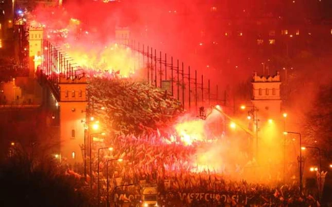 La „Marşul Independenţei“, 60.000 de polonezi au defilat, sâmbătă, pe străzile Varşoviei cu torţe aprinse, scandând „Polonia pură, Polonia albă!“. Pretextul a fost aniversarea, ca în fiecare an din 2009 încoace, a renaşterii statului polonez în 1918, după 123 de ani de divizare sub stăpânirea vecinilor – Rusia, Prusia şi Austria. Dincolo de lozincile „naţionalismului morbid“, după cum l-a condamnat ieri preşedintele Andrzej Duda, tineri purtând cagule şi însemne fasciste au lovit femei în vârstă care condamnau extremismul. Imaginile pătează grav imaginea unei Polonii tot mai îndepărtate de idealurile „Solidarităţii“.