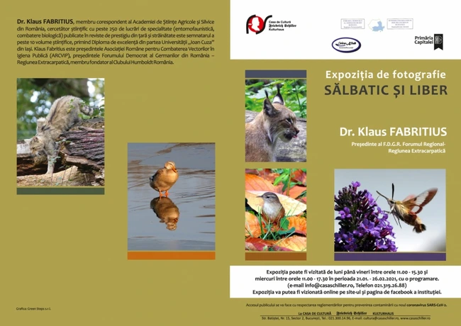 0Casa de Cultură „Friedrich Schiller” a lansat astăzi la sediul din Str. Batiştei nr. 15 din Bucureşti o expoziţie de fotografie intitulată „SĂLBATIC ŞI LIBER”, realizată de dr. Klaus FABRITIUS, Preşedintele F.D.G.R. Forumul Regional – Regiunea Extracarpatică.