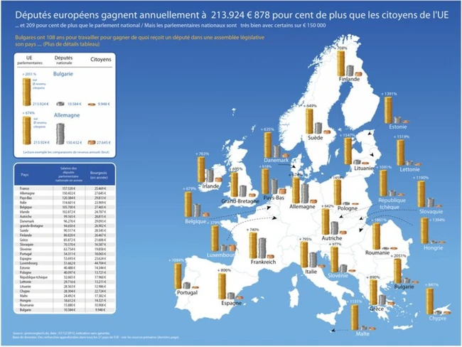 Parlamentarii din Europa câştigă în medie cu 878% mai mult decât cetăţenii europeni... Avem 8185 de parlamentari în UE pentru 500 milioane de cetăţeni...Cetăţenii bulgari ar trebui să muncească 108 ani pentru a realiza venitul obţinut doar într-o singură legislatură de un conaţional de-al lor, europarlamentar...