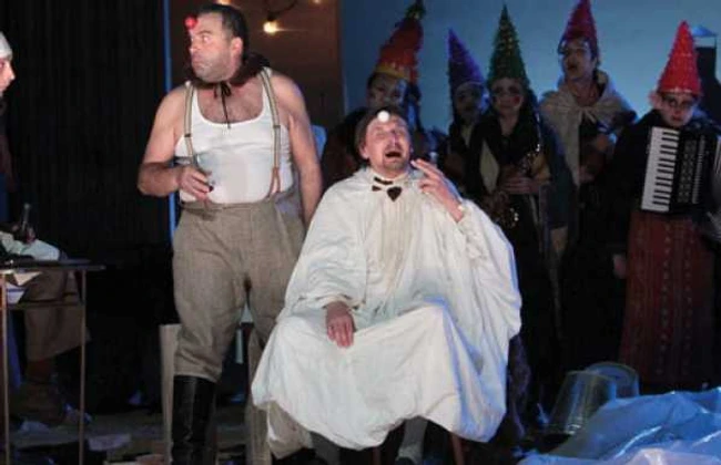 În spectacolul de la Sibiu, goana aceasta este adesea una voit împiedicată, parcă anume gândită în acest chip spre a se arăta că nici astfel pentagonul amplificat prin voinţã regizorală nu poate ajunge la autenticitate. În spatele scenei a apărut grătarul de mititei, şi-au făcut de asemenea apariţia şi mascaţii, gunoierii, bucătăresele, corul (Mihai Coman, Florin Coşuleţ, Viorel Raţă, Cristina Stoleriu), iar pe laterală chelnerul, parcă ceva mai înviorat, toarnă mecanic halbe de bere şi mastică. Celor doi încornoraţi, Iancu Pampon şi Crăcănel, scenograful Dragoş Buhagiar le-a găsit costume cât se poate de potrivite - primul e deghizat în urs, cel de-al doilea în iepure, fiecare purtând şi un caracterizant nas de clovn- în vreme ce nevinovatul Catindat e înveşmântat în mireasă.