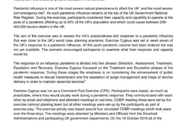 Concluzia era că Marea Britanie nu era pregătită în mod corespunzător pentru a face faţă "solicitărilor extreme" în cazul unei pandemii de gripă definită, încă de atunci, drept "cel mai important risc" la nivelul dezastrelor civile. Se vorbea în document despre "o lipsă a planurilor comune la nivel tactic" în domeniul sistemelor publice de medicină de urgenţă şi se exprimau îngrijorări asupra capacităţii sistemului public de sănătate vor fi în stare să ofere nivelul de sprijin cerut cazul unei sitaţii extrem de serioase la nivel naţional.