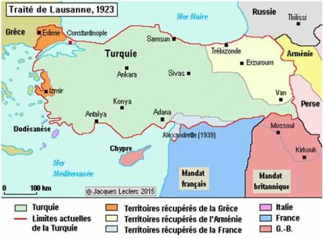 Tratatul de la Lausanne fixează limitele teritoriale ale Turciei, confirmarea suveanităţii asupra Strâmtorilor dar şi o recalculare a datoriei de război, urmând ca doar 40% din sumă să fie plătită de Turcia, celalată parte fiind împărţită între noile state suverane născute din dezmembrarea Imperiului Otoman.