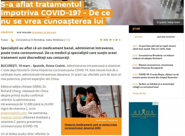 De pe bursa intoxicaţiilor de presă nu putea lipsi oficiosul Kremlinului, agenţia Sputnik care produce text şi în limba română. Un exemplu care ilustrează lipsa de scrupule a propagandei ruseşti în România a fost o „ştire” falsă până în măduvă promovată de Sputnik: aceea că vitamina C ar trata cu succes cazurile de infectare cu noul coronavirus COVID-19. Pe data de 10 martie, imundul site Sputnik în limba română a publicat un articol cu titlul „S-a aflat tratamentul împotriva COVID-19? De ce nu se vrea cunoaşterea lui” în care se afirmă că vitamina C este eficientă în tratarea pandemiei care la ora actuală zgâlţâie din temelii întreaga planetă.