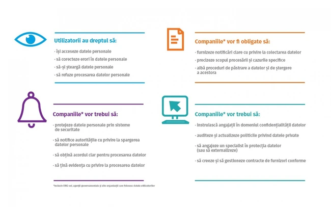 Potrivit noilor reguli (Regulamentul UE 2016/67 - GDPR), aplicabile de la 25 mai 2018, companiile trebuie să ofere mai multe informaţii legate de modul în care colectează şi păstrează date ale clienţilor, să le ofere acestora dreptul de a fi şterşi din evidenţe şi să implementeze reguli speciale de protecţie a minorilor. De asemenea, orice scurgere de date va trebui notificată în cel mult 72 de ore la autoritatea de supraveghere. Potrivit Ralucăi Ghilea, Director Executiv al Perceptum, începând din 2018, cele mai multe companii vor fi nevoite să-şi ajusteze modelele de business în funcţie de aceste restricţii.
