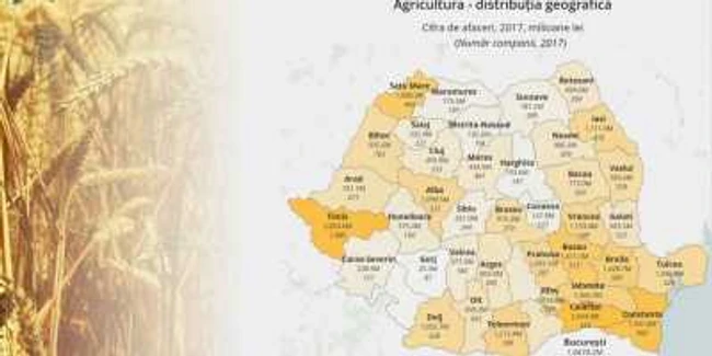 Potrivit datelor KeysFin, cele mai mari afaceri din agricultura românească sunt realizate în judeţele Timiş (2,85 miliarde de lei), Călăraşi (2,54 miliarde de lei), Constanţa (1,93 miliarde de lei), Buzău şi Satu Mare cu afaceri de câte 1,6 miliarde de lei fiecare.