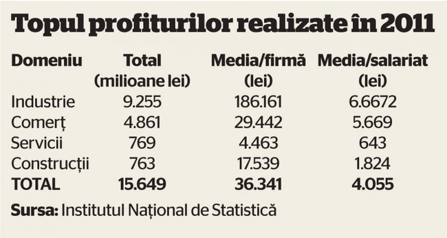 Dacă în 2008 România avea 534.525 de firme în care lucrau 4,41 milioane de salariaţi, acum mai funcţionează doar 430.608 firme cu doar 3,8 milioane de salariaţi. Investiţiile acestora au scăzut de la 144 la 143,3 miliarde de lei, iar profiturile s-au înjumătăţit. Totalul profiturilor obţinute în 2008 era de 32,5 miliarde de lei, pentru ca în 2011 suma să scadă la 15,6 miliarde de lei.