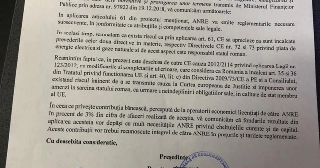 „Semnalăm că există riscul ca prin aplicarea art. 61, CE să aprecieze că sunt încălcate prevederile celor două directive în materie, respectiv Directivele CE nr. 72 şi 73 privind piaţa de energie electrică şi gaze naturale şi de acest aspect este responsabil statul român”, se arată în scrisoarea intrată în posesia economica.net.