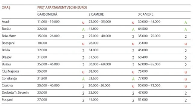 În zonele centrale, apartamentele cu două camere confort unu, decomandat sau semidecomandat, cu îmbunătăţiri medii au preţuri cuprinse între 30.000 şi 35.000 de euro. Cele similare din zone periferice au costuri situate în intervalul 25.000 - 30.000 de euro.