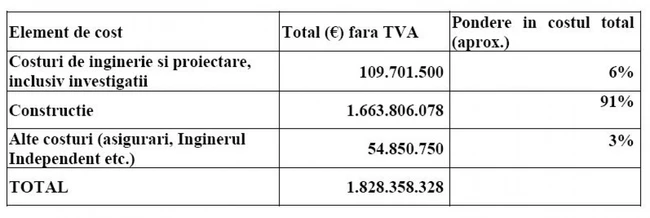 Fata de estimarile de costuri efectuate la faza de Studiu de Fezabilitate, in anul 2006, costurile diverselor categorii de lucrari prezentate de ofertantul câştigător in oferta sa sunt in general comparabile, cu variatii care se datoreaza in mare masura variantei de traseu propuse de ofertantul câştigător, care este diferita de cea propusa la Studiul de Fezabilitate si din care au rezultat noi solutii ingineresti, precum si modificarilor reglementarilor legislatiei nationale, a celor tehnice nationale si europene si progreselor tehnologice care s-au inregistrat din anul 2006 pana in prezent.
