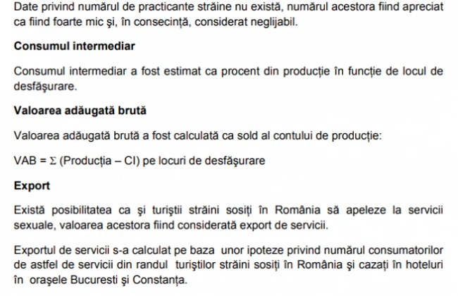 „Indicatorii estimaţi pentru prostituţie sunt: producţia; consumul intermediar; valoarea adăugată brută; consumul final al gospodăriilor populaţiei; export.