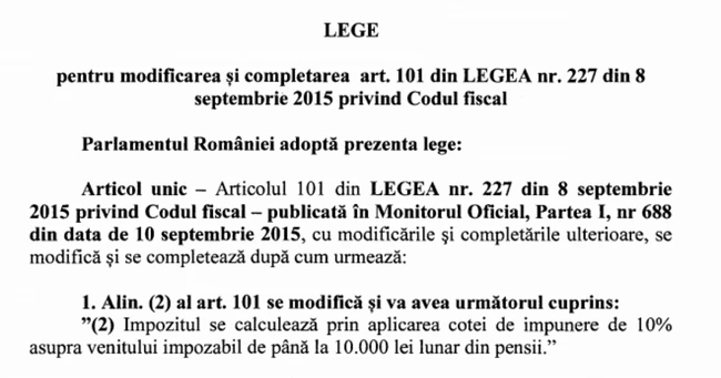 “Impozitul se calculează prin aplicarea cotei de impunere de 10% asupra venitului impozabil de până la 10.000 lei lunar din pensii”, se arată în Propunerea legislativă pentru modificarea şi completarea art.101 din Legea nr.227/2015 privind Codul fiscal.