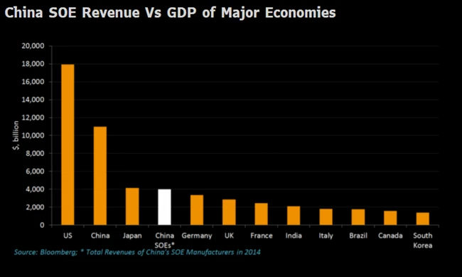 0Dacă toate societăţile de stat din China ar fi o naţiune de sine stătătoare, acestea ar fi a patra economie a lumii, cu venituri totale de aproximativ 4.000 de miliarde de dolari şi ar fi mai mare decât economia Germaniei, care se situa la 3.025 miliarde de euro în 2015, echivalentul a 3.368 miliarde de dolari, potrivit unei analize realizate de către Bloomberg Intelligence.