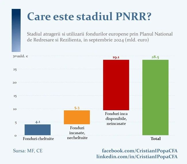 „Cu o alocare totală de 28,5 miliarde euro (13,6 miliarde euro granturi şi 14,9 miliarde euro împrumuturi), PNRR ar trebui să accelereze modernizarea infrastructurii, digitalizarea administraţiei publice şi îmbunătăţirea sectoarelor esenţiale precum sănătatea şi educaţia, cu bani europeni. Cu toate acestea, România se confruntă cu întârzieri majore. Până la sfârşitul lunii septembrie 2024, din totalul de 28,5 miliarde euro, ţara noastră a încasat doar 9,4 miliarde euro, adică aproximativ o treime. Problema este că, din aceşti bani, doar 4,1 miliarde euro erau efectiv cheltuite la finalul trimestrului III din 2024”.