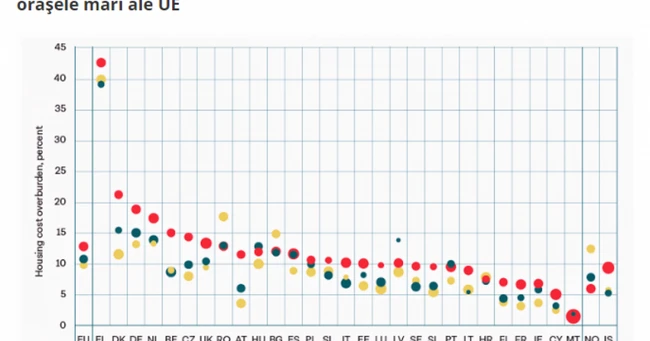 Sursa: Programul Habitat al CE şi ONU 2016, pe baza datelor de la Eurostat. Notă: UE28 = toate cele 28 de state membre ale Uniunii Europene. Costul locuinţelor este măsurat ca procent din gospodăriile care cheltuiesc mai mult de 40% din venitul disponibil pentru locuinţe. Dimensiunea bulinei reprezintă cota parte din populaţia naţională care locuieşte în zonă.