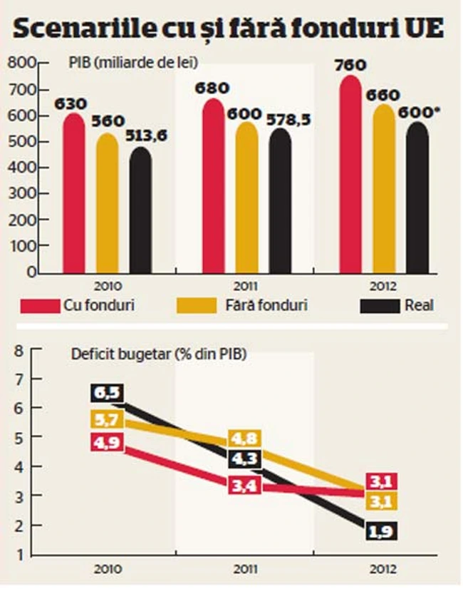 Deficitul bugetar ar fi fost de numai 4,9% din PIB (în loc de 6,5%) în 2010 şi de 3,4% în 2011 (faţă de 4,35%). Pentru 2012, modelarea CNP arată că am fi avut un PIB de peste 760 de miliarde de lei cu absorbţia completă a fondurilor UE - a se compara cu cea mai optimistă estimare lansată recent de Ministerul Finanţelor, respectiv puţin peste 600 de milioane de lei.