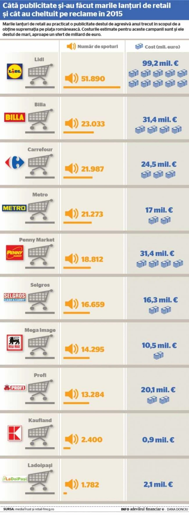 Studiul mediaTRUST estimează că Lidl a chletuit anul trecut peste 99 de milioane dee uro pentru publicitate, în timp ce Billa a avut un buget de 31,4 milioane de euro, iar Carrefour 24,5 milioane de euro.