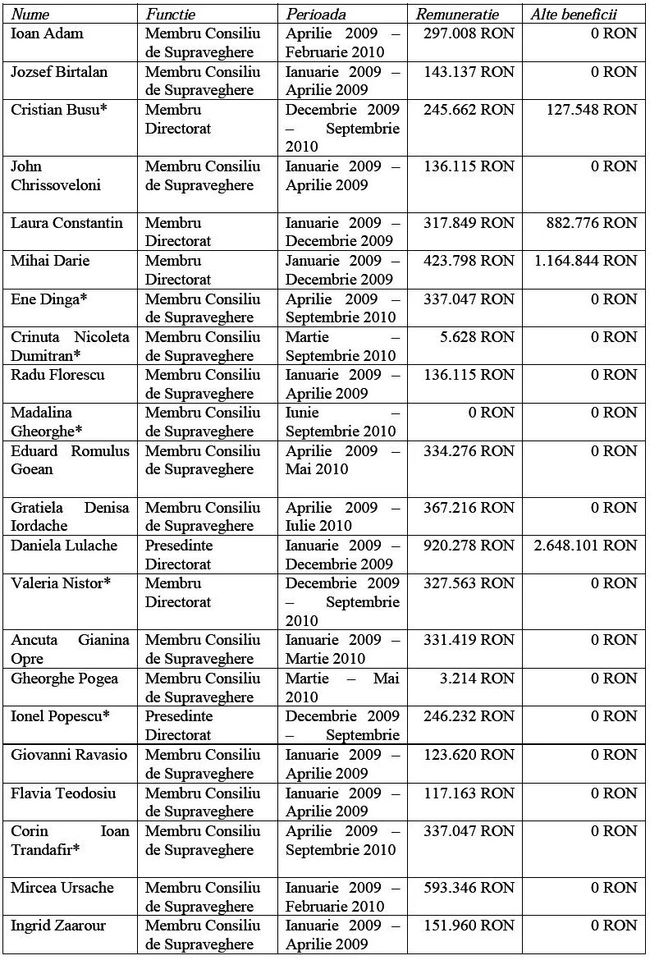 În 2009, câştigurile directorilor au însumat 5,46 milioane de lei, de peste şase ori mai mult decât în 2008. „Creşterea salariilor plătite directorilor în 2009 se bazează pe decizia Consiliului de Supraveghere nr. 301/22.12.2009, conform căreia se acordă salarii compensatorii directorilor ale căror contracte au fost reziliate, bonusuri de performanţă pentru depăşirea profitului bugetat şi plata zilelor de concediu neefectuat", se arată în documentul citat.