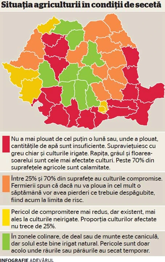 Seceta a lovit şi în această vară, la fel ca în toamna trecută, mai mult de o treime din judeţele ţării şi, pe măsură ce ploile întârzie, suprafeţe tot mai mari de culturi sunt compromise. Statisticile naţionale şi judeţene arată că printre cele mai afectate culturi se numără grâul, porumbul, rapiţa, floarea-soarelui şi cartofii.