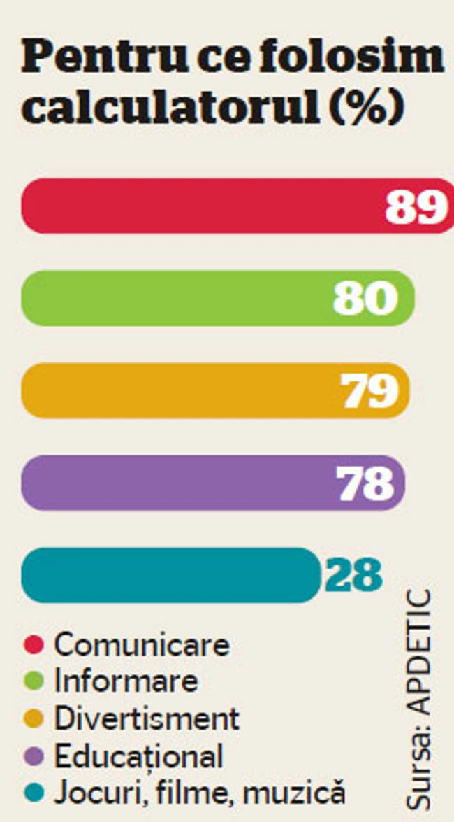 Cel puţin aşa reiese din chestionarul online iniţiat de Asociaţia Producătorilor şi Distribuitorilor de Echipamente IT&C (APDETIC), la care au răspuns peste 10.000 de persoane. Chestionarul relevă faptul că folosim computerul pe post de unealtă pentru comunicare, ceea ce reprezintă un lucru firesc, spun specialiştii. Tot ei susţin că românii mai utilizează calculatorul şi pentru a se informa şi educa.