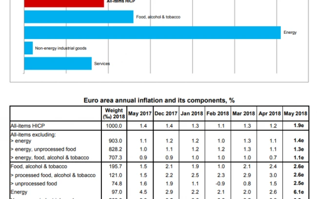 Potrivit informării Eurostat, se preconizează că energia va avea cea mai mare rată anuală în luna mai (6,1% comparativ cu 2,6% în aprilie), urmată de alimente, alcool şi tutun (2,6% faţă de 2,4% ), servicii (1,6%, comparativ cu 1,0% în luna aprilie) şi bunuri industriale neenergetice (0,2%, comparativ cu 0,3% în luna aprilie).