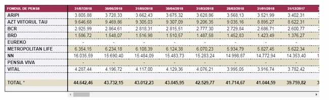 Potrivit ASF, fondurile de pensii private obligatorii aveau active în valoare de 44,64 miliarde de lei, la 31 iulie 2018, cu 20% mai mult decât în luna similară a anului trecut, şi cu aproape 1 miliard de lei mai mult decât în luna iunie 2018.