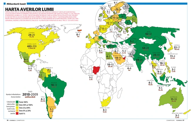 Faţă de anul trecut, averile mondiale şi-au revenit, ba chiar au cunoscut câştiguri substanţiale. Această hartă arată schimbările în numărul miliardarilor din fiecare ţară în ultimele 12 luni, precum şi împărţirea globală a celor 1.200 de miliarde de dolari care au apărut în plus în acest an. Cincizeci şi cinci de ţări au acum miliardari în topul Forbes, faţă de 53 anul trecut. Pakistan şi Finlanda apar pentru prima oară în clasament, Belize revine iar Islanda dispare de pe harta bogăţiei. Doar cinci ţări - Germania, Nigeria şi trei din Orientul Mijlociu - au mai puţini titani faţă de anul trecut.