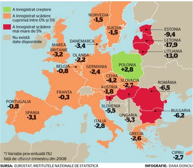 „Adevărul" a realizat o radiografie a evoluţiei economiilor Europene. Criza economică nu a ocolit nicio economie. România a înregistrat anul trecut o scădere economică de 7,1%, toate sectoarele având o contribuţie negativă la formarea PIB, potrivit datelor publicate de Institutul Naţional de Statistică. Dacă cei mai mulţi analişti se aşteptau ca ultimul trimestru din 2009 să ne aducă ieşirea din recesiune, ei bine, s-au înşelat.