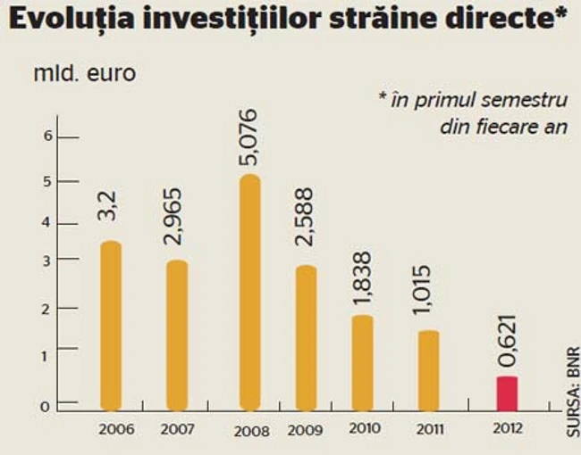 Prima jumătate a acestui an a fost perioada în care România a atras mai puţin de un miliard de euro investiţii străine directe - un minim-record care n-a mai fost consemnat în aceleaşi intervale din ultimii şapte ani. În primul semestru din acest an, potrivit datelor comunicate ieri de Banca Naţională, investiţiile străine au însumat doar 0,6 miliarde de euro, după ce în aceleaşi perioade din 2007-2009 depăşeau 2,5 miliarde de euro, iar în 2010-2011 treceau de un miliard de euro.