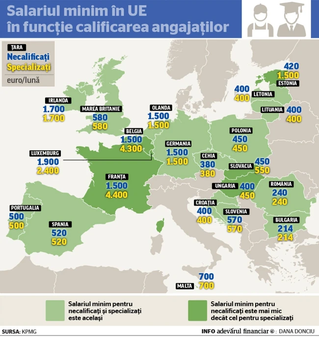 INFOGRAFIE Salariul minim în UE: în ce ţări se fac diferenţe între muncitorii necalificaţi şi cei cu pregătire superioară