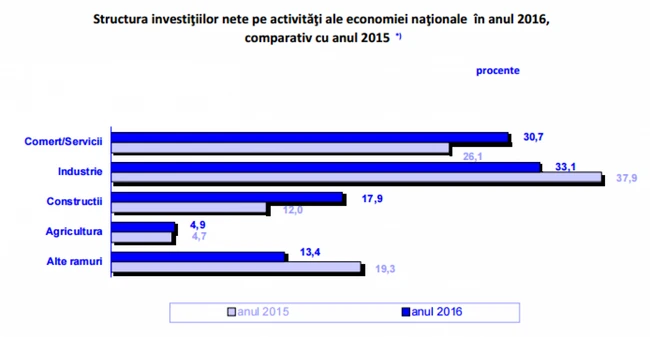 Dacă privim structura investiţiilor nete pe activităţi ale economiei naţionale în anul 2016, comparativ cu anul 2015, observăm că dominante sunt investiţiile în industrie, cu 33,1% din total, în scădere totuşi cu 4,8 puncte procentuale. În schimb, a existat o creştere a investiţiilor în comerţ/servicii, cu 4 puncte procentuale, până la un total de 30,7% din total. În ceea ce priveşte construcţiile, acestea au înregistrat un avans de 5,9 puncte procentuale, până la 17,9% din totalul investiţiilor, iar agricultura a primit doar 4,9% din investiţii, în creştere uşoară cu 0,2 puncte procentuale.