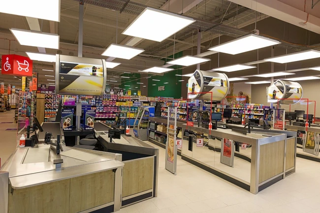 Hipermarketul este dotat cu 8 case de marcat standard, raion extins de legume şi fructe, vitrină cu servire asistată cu o lungime de 20 metri, pentru o varietate mare de produse proaspete şi, de asemenea, brutărie, raion de produse congelate, alimente de bază, dulciuri, băuturi, produse nealimentare şi drogherie.