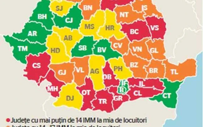 În fine, studiul a mai relevat o densitate extrem de scăzută a IMM-urilor (număr de firme la mia de locuitori - vezi harta alăturată) în majoritatea judeţelor ţării. Lucian Croitoru a arătat, în acest context, că statul ar trebui să stimuleze cultura antreprenorială „ca alternativă la găsirea de locuri de muncă", aşa cum în ţările nordice europene sau în SUA astfel de abilităţi sunt tot mai intens cultivate în învăţământul liceal.