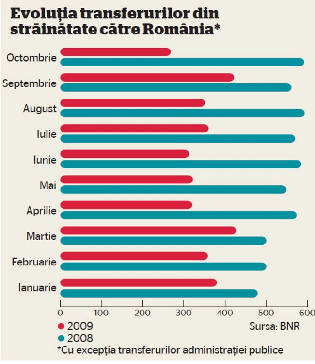 Pentru intervalul ianuarie-octombrie 2009, remiterile românilor care lucrează peste graniţă s-au ridicat la doar 3,5 miliarde de euro. Valoarea acestora este emnificativ mai mică comparativ cu cea de 5,5 miliarde de euro atinsă în perioada similară din 2008.