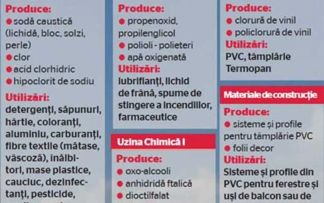 Oamenii combinatului spun că la Oltchim se produc materii prime şi ingrediente pentru 80% din obiectele din jurul nostru. Şi, într-adevăr, la Oltchim nu se produce hârtie, ci aditivii necesari în fabricarea acesteia; nu se produc obiecte din plastic, dar toate fabricile de mase plastice au nevoie de materia primă de la Oltchim. Fibrele sintetice, cauciucul, articolele ceramice, lacurile, vopselele, zugrăvelile, detergenţii şi chiar unele medicamente se fabrică în alte locuri, nu la Râmnicu Vâlcea, dar ingredientele din care sunt făcute provin de la Oltchim. În combinatul vâlcean se produc cloruri, oxo-alcooli, polioli, anhidride etc. - mărfuri pe care nu le găsim la tarabă, dar fără de care o întreagă industrie nu poate funcţiona.